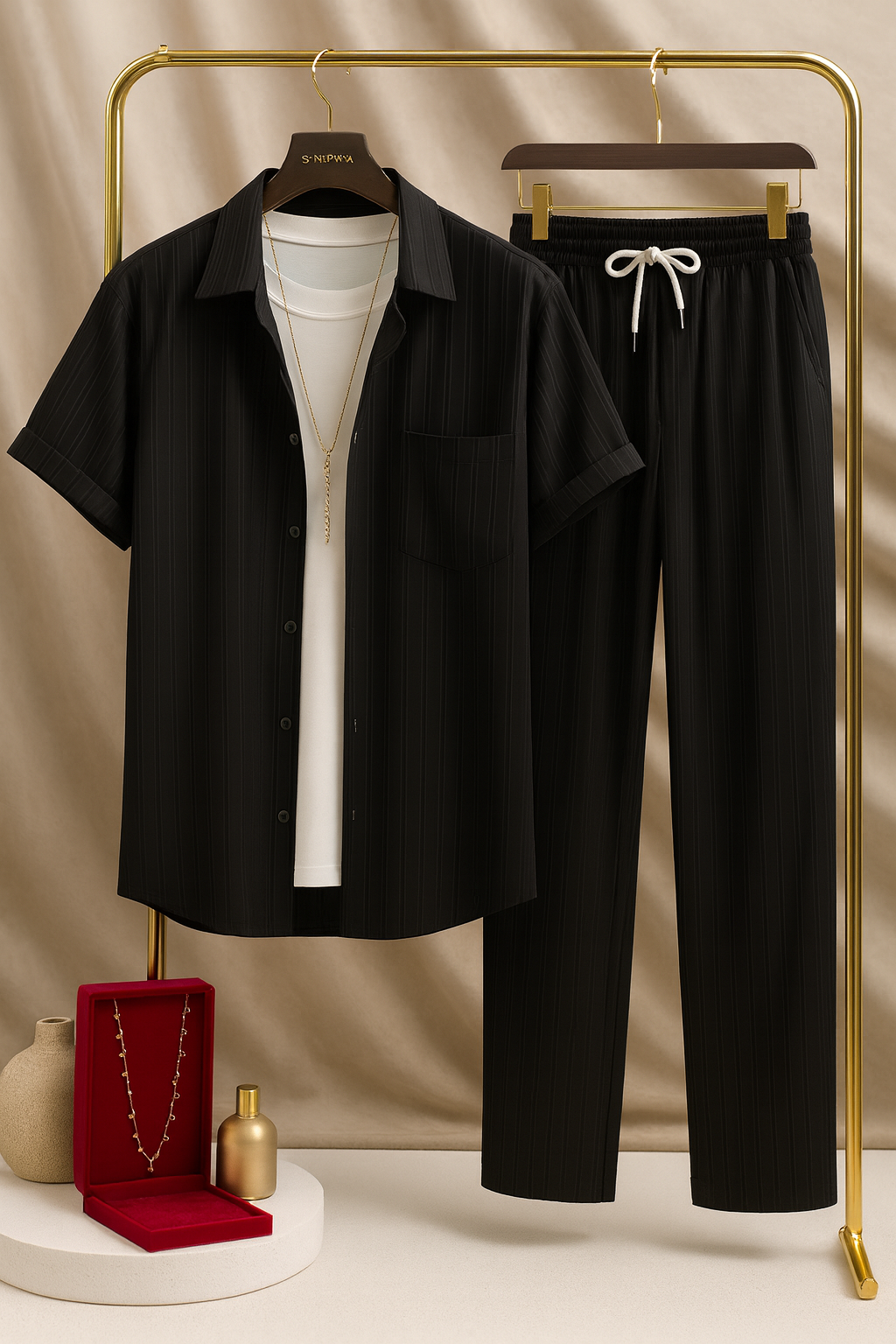 Upgrade your everyday style with this sleek black short-sleeve button-down shirt, designed with subtle vertical pinstripes for a refined, modern look. The lightweight fabric and relaxed fit make it perfect for layering over a basic tee, giving you an effortless outfit for both casual and smart-casual occasions. Finished with a clean chest pocket and smooth button front, this shirt delivers comfort, versatility, and understated style in one essential piece.